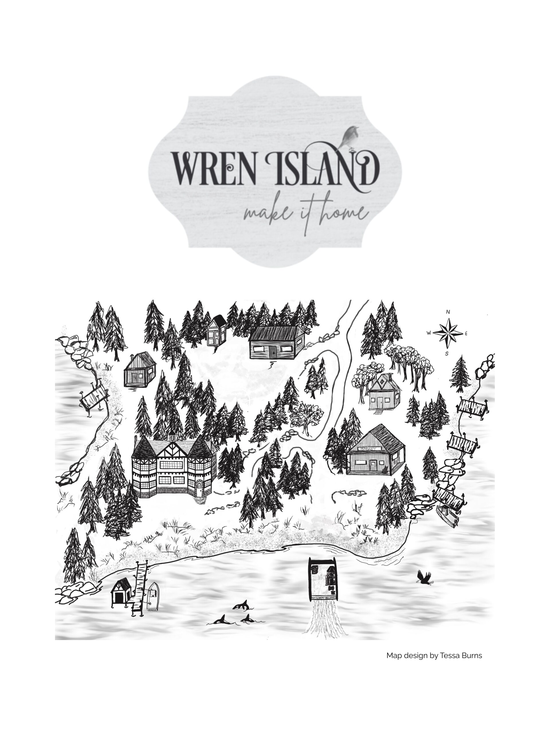 But thanks to the creative efforts of Tessa Burns, we do have a map of Wren Island! On it, you’ll find Allison’s English Tudor style house and Virgil’s grocery market. The landing where Ralph runs Lucy Jo up the beach. Allison’s dock and boathouse. Orcas! And so much more.